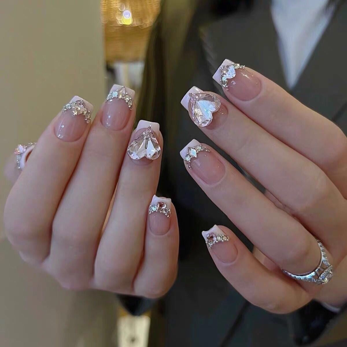 Step into luxury with our Crystal Romance press-ons, designed to turn every gesture into a statement. Featuring a chic square shape with a soft nude base and classic French white tips, each nail is adorned with sparkling rhinestones and stunning oversized crystal heart accents. These nails capture the perfect balance of elegance and glamour.