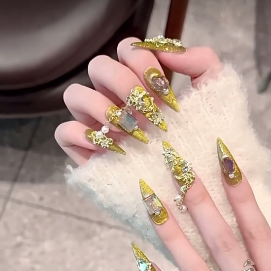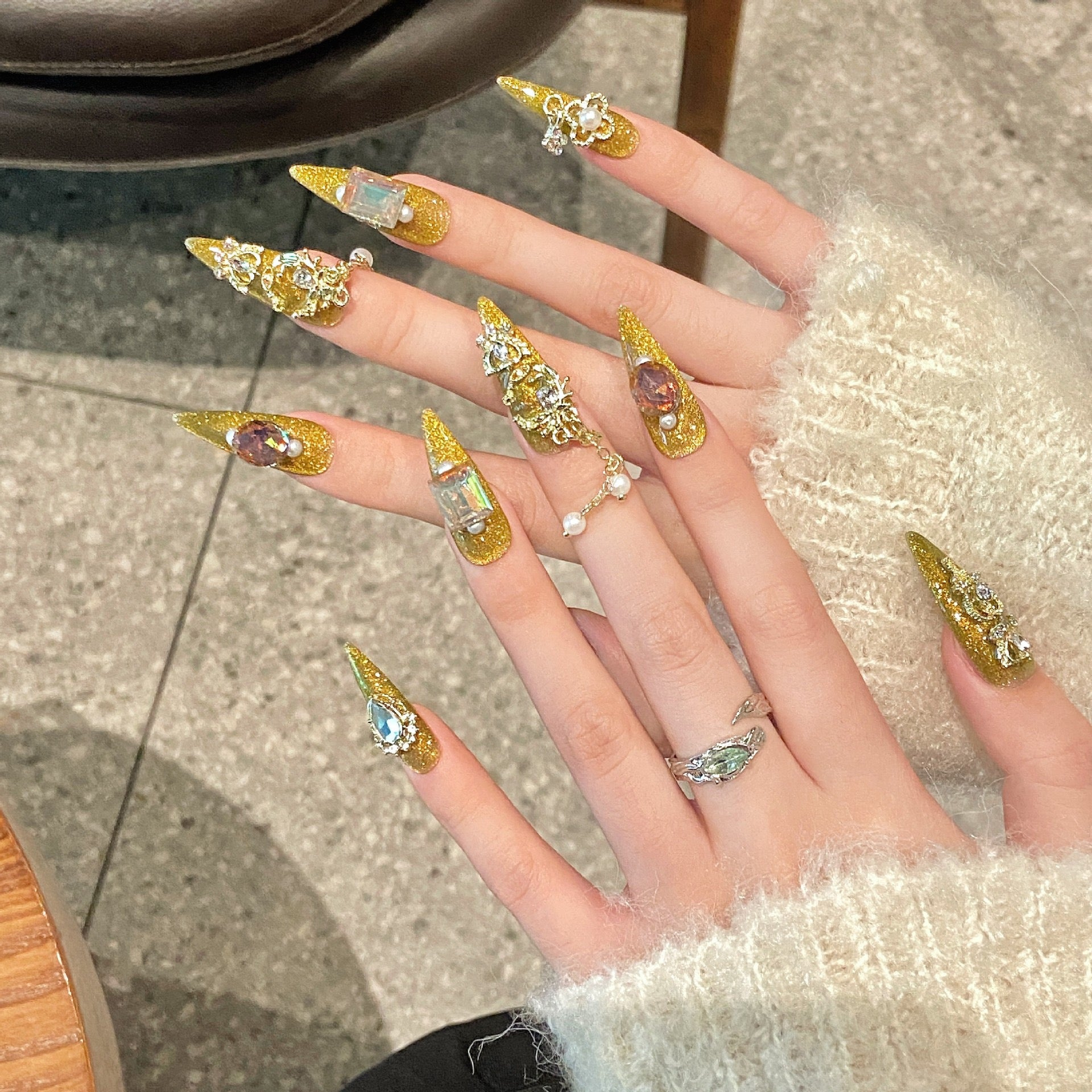 - Style: Shimmering gold base, multi-faceted gemstones, pearl accents, gold filigree, long stiletto shape, high-gloss finish.