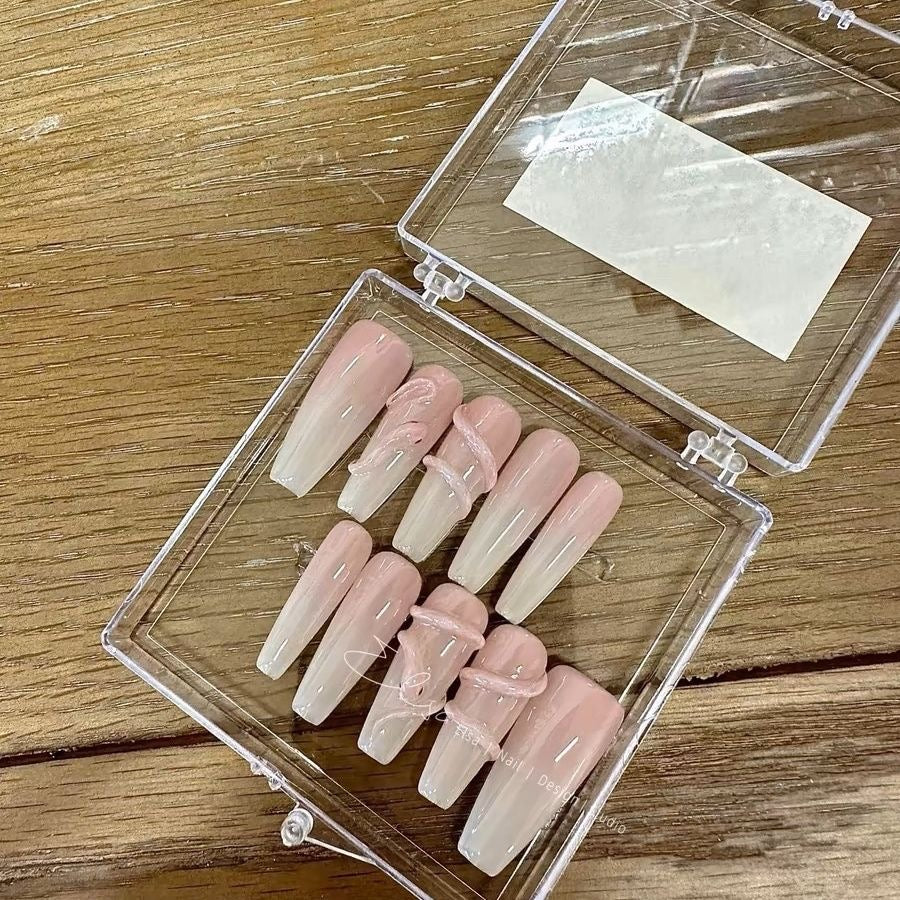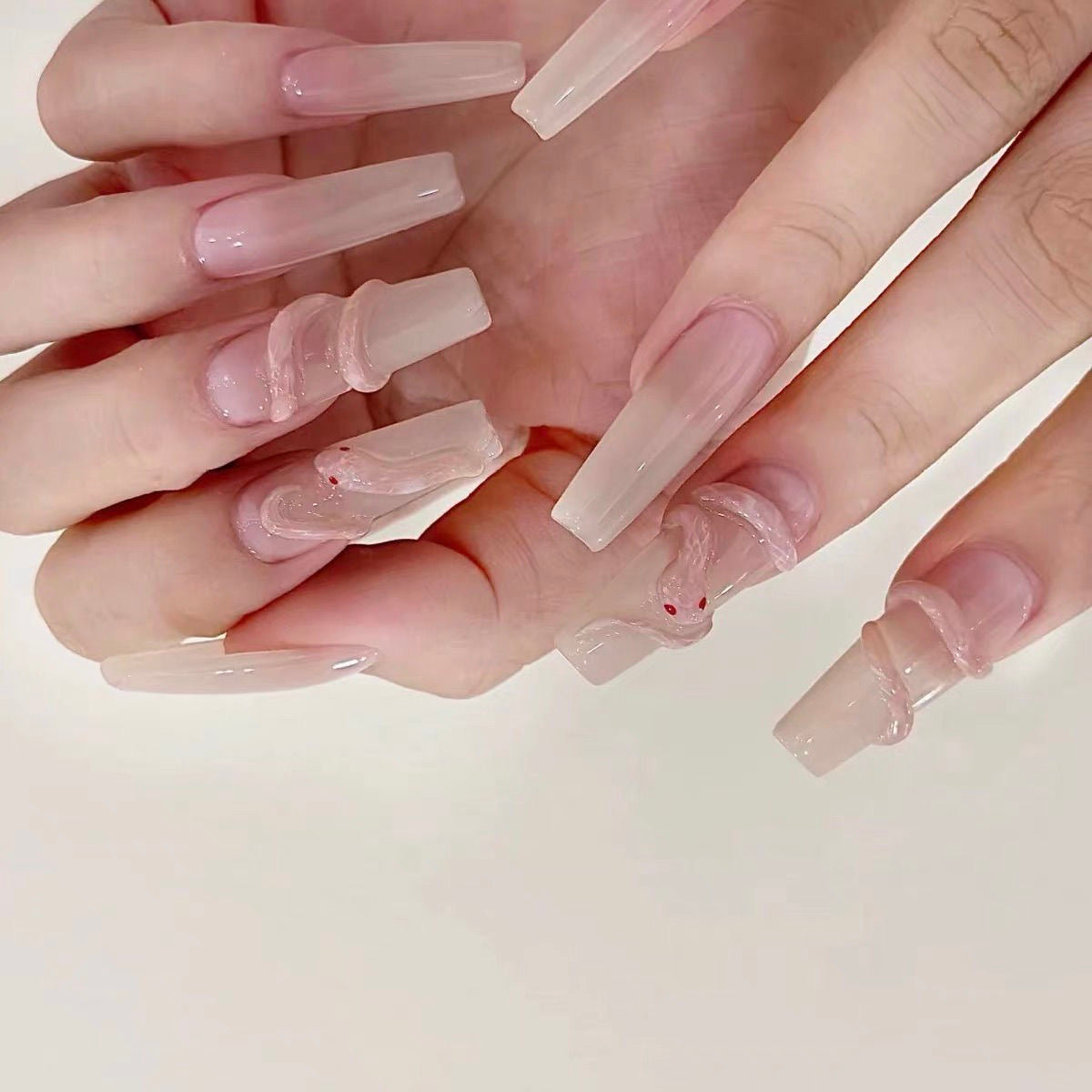 These avant-garde press-on nails feature a bold, sculptural design that merges elegance with a surreal edge. The base is a long, coffin-shaped nail with a glossy nude-pink ombré finish, giving the illusion of elongated, ethereal fingers. What sets this set apart are the three-dimensional, serpentine details curling across select nails — translucent swirls with a soft, fleshy tone, accented by tiny red dots that mimic the eyes of miniature snakes.