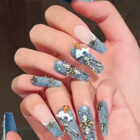 - Style: Denim texture, 3D character charms (kitty, dolphin), silver hardware, rhinestone accents, long coffin shape, glossy finish.